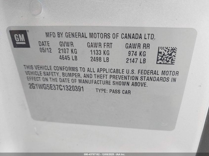 2012 CHEVROLET IMPALA 2012 року Бензин, 3.6, Передній привід, vin - 2G1WG5E37C1320391 з США