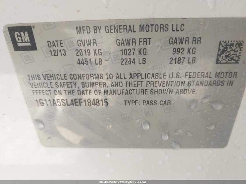 2014 CHEVROLET MALIBU 2014 року Бензин, 2.5, Передній привід, vin - 1G11A5SL4EF184815 з США