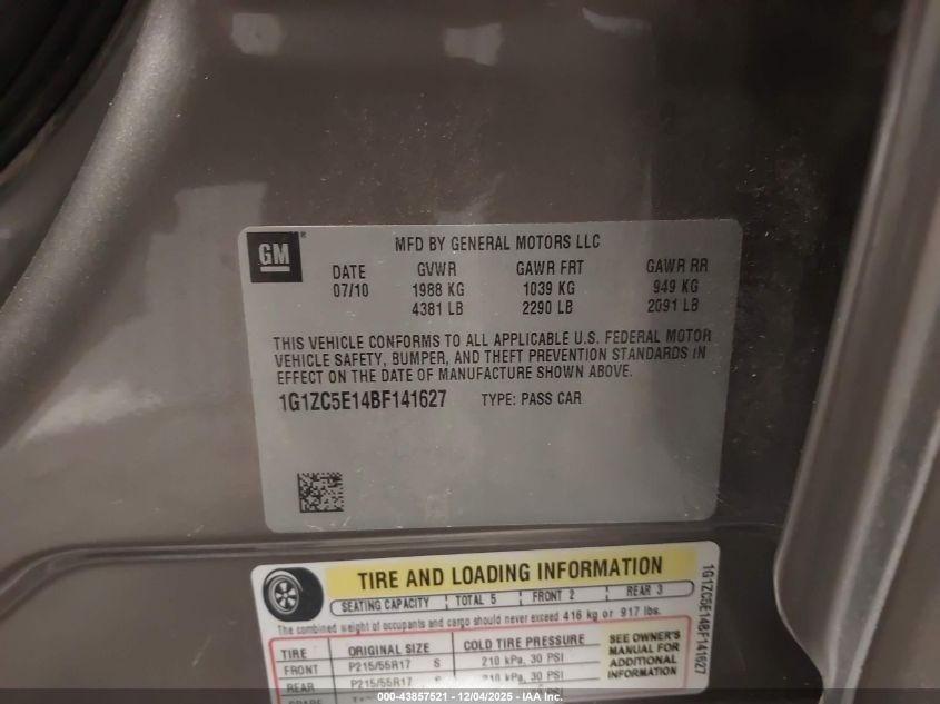 Колір СірийЦиліндри 4Привід Передній привідVIN 1G1ZC5E14BF141627Стан СтаціонарноУшкодження Передня або задня