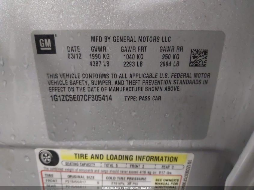 2012 CHEVROLET MALIBU 2012 року Бензин, 2.4, Передній привід, vin - 1G1ZC5E07CF305414 з США