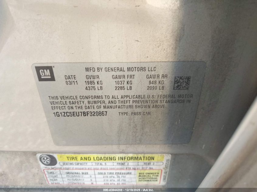 Колір ЗолотийЦиліндри 4Привід Передній привідVIN 1G1ZC5EU7BF320867Стан СтаціонарноУшкодження Передня або задня
