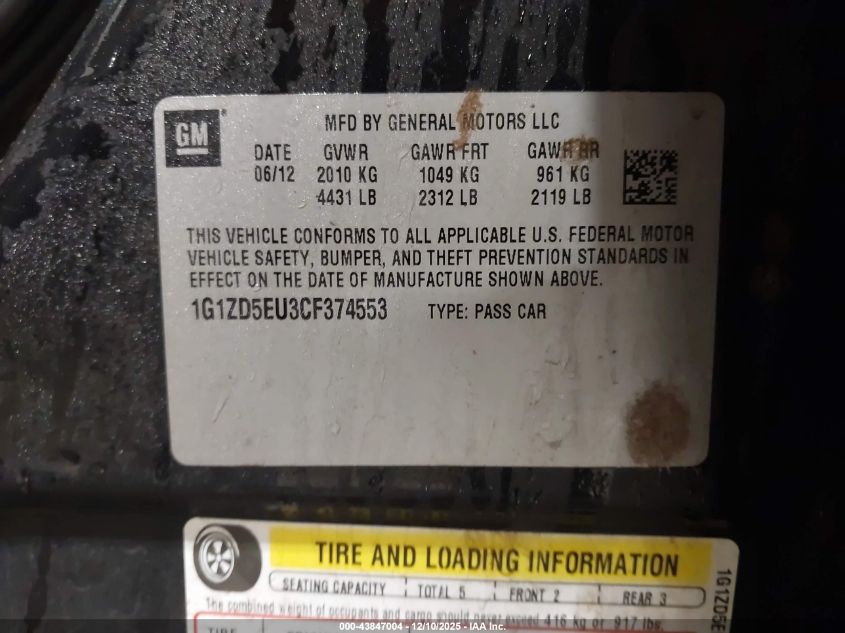 2012 CHEVROLET MALIBU 2012 року Бензин, 2.4, Передній привід, vin - 1G1ZD5EU3CF374553 з США