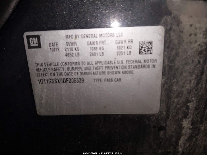 2013 CHEVROLET MALIBU 2013 року Бензин, 2.0, Передній привід, vin - 1G11G5SX0DF206339 з США