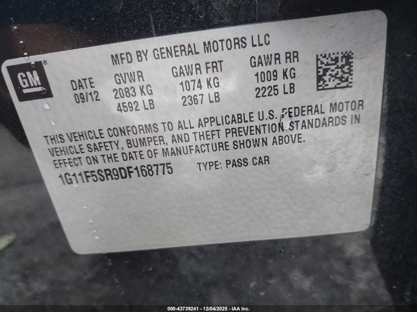 2013 CHEVROLET MALIBU 2013 року Бензин, 2.4, Передній привід, vin - 1G11F5SR9DF168775 з США