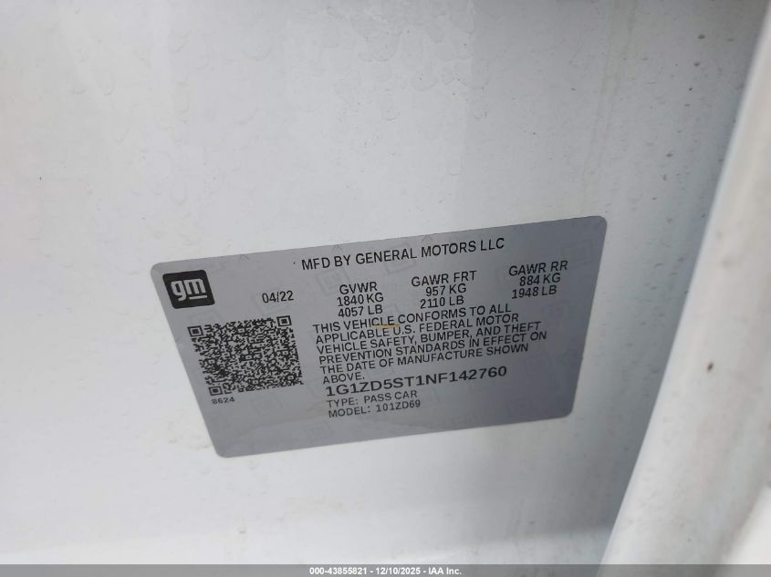 2022 CHEVROLET MALIBU 2022 року Бензин, 1.5, Передній привід, vin - 1G1ZD5ST1NF142760 з США