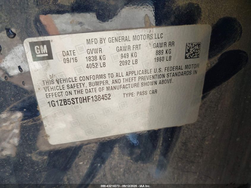 2017 CHEVROLET MALIBU 2017 року Бензин, 1.5, Передній привід, vin - 1G1ZB5ST0HF138452 з США