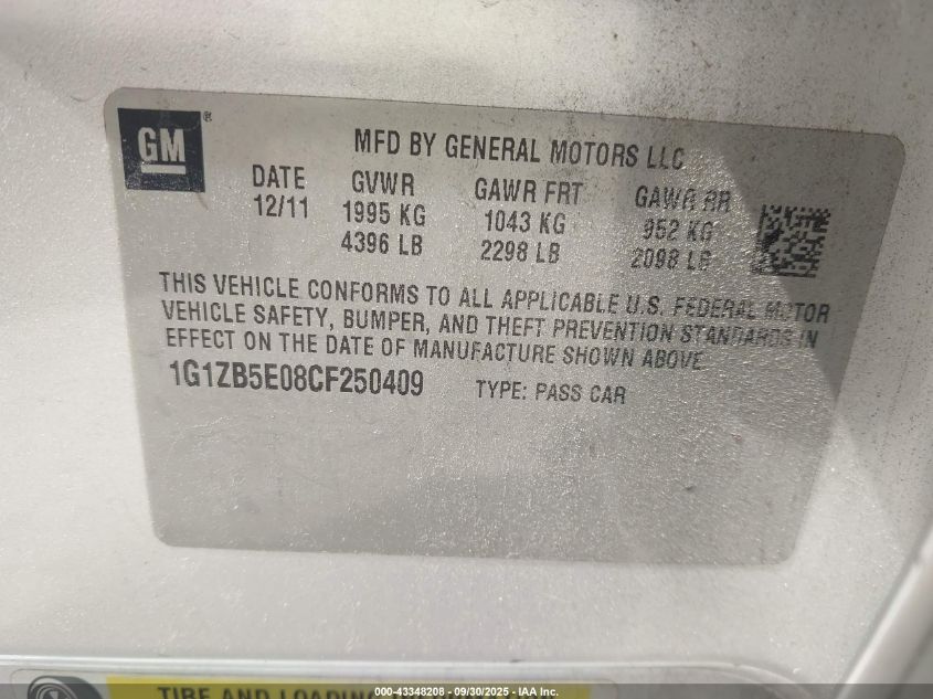 2012 CHEVROLET MALIBU 2012 року Бензин, 2.4, Передній привід, vin - 1G1ZB5E08CF250409 з США
