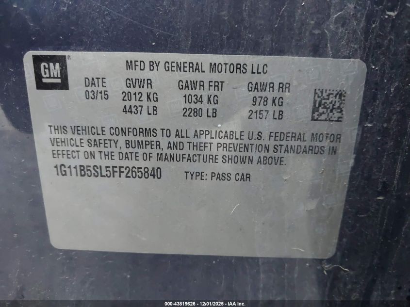 2015 CHEVROLET MALIBU 2015 року Бензин, 2.5, Передній привід, vin - 1G11B5SL5FF265840 з США