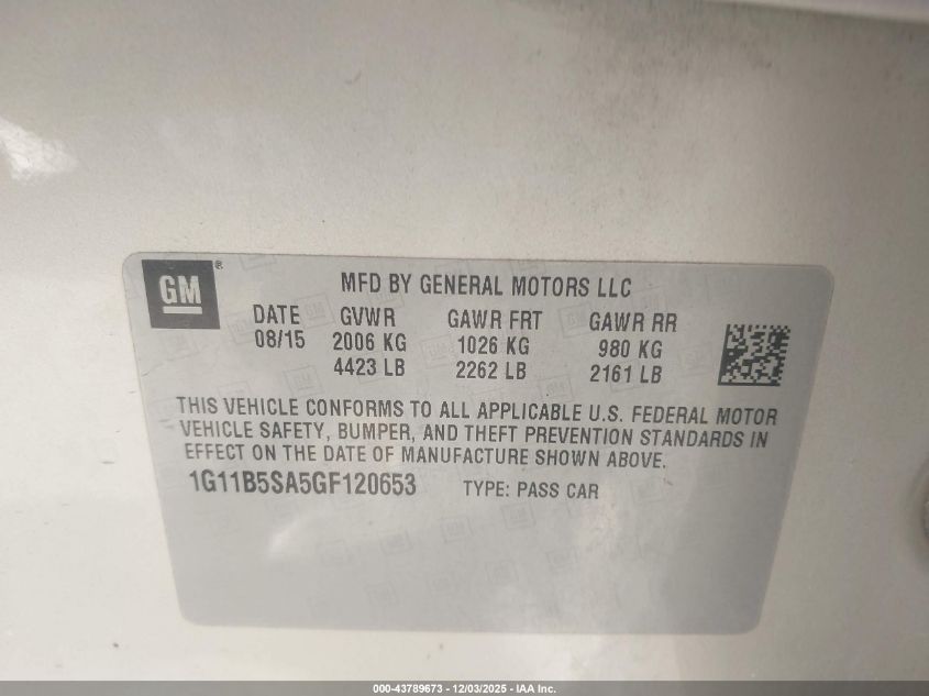 2016 CHEVROLET MALIBU 2016 року Бензин, 2.5, Передній привід, vin - 1G11B5SA5GF120653 з США