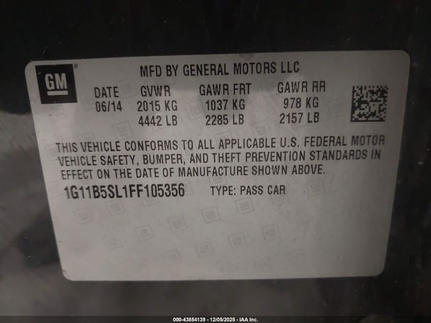 2015 CHEVROLET MALIBU 2015 року Бензин, 2.5, Передній привід, vin - 1G11B5SL1FF105356 з США