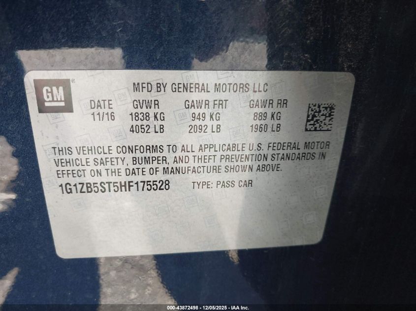 2017 CHEVROLET MALIBU 2017 року Бензин, 1.5, Передній привід, vin - 1G1ZB5ST5HF175528 з США