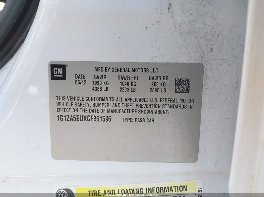 2012 CHEVROLET MALIBU 2012 року Бензин, 2.4, Передній привід, vin - 1G1ZA5EUXCF361596 з США