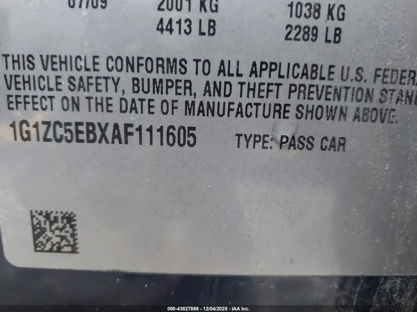 Колір СинійЦиліндри 4Привід Передній привідVIN 1G1ZC5EBXAF111605Стан СтаціонарноУшкодження Звичайний знос
