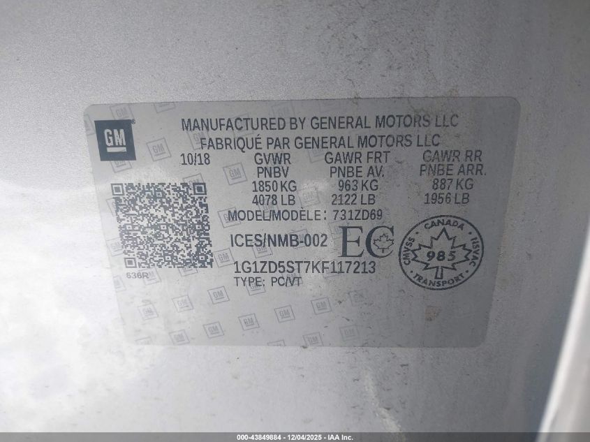 2019 CHEVROLET MALIBU 2019 року Бензин, 1.5, Передній привід, vin - 1G1ZD5ST7KF117213 з США