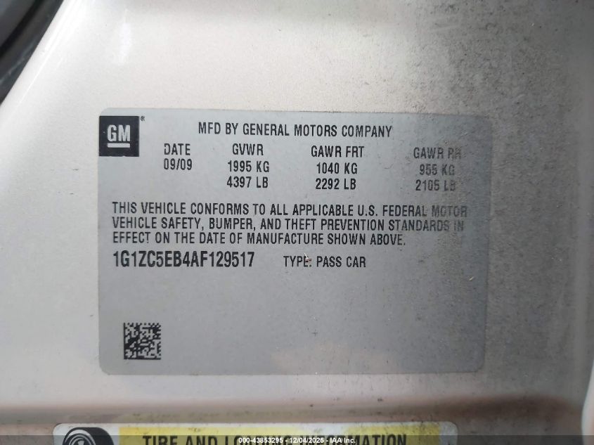 Колір БежевийЦиліндри 4Привід Передній привідVIN 1G1ZC5EB4AF129517Стан Заводиться та їде (перевірено)Ушкодження Передня або задня
