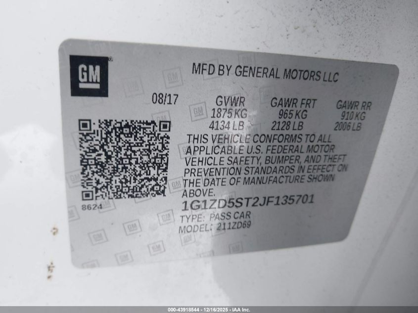 2018 CHEVROLET MALIBU 2018 року Бензин, 1.5, Передній привід, vin - 1G1ZD5ST2JF135701 з США