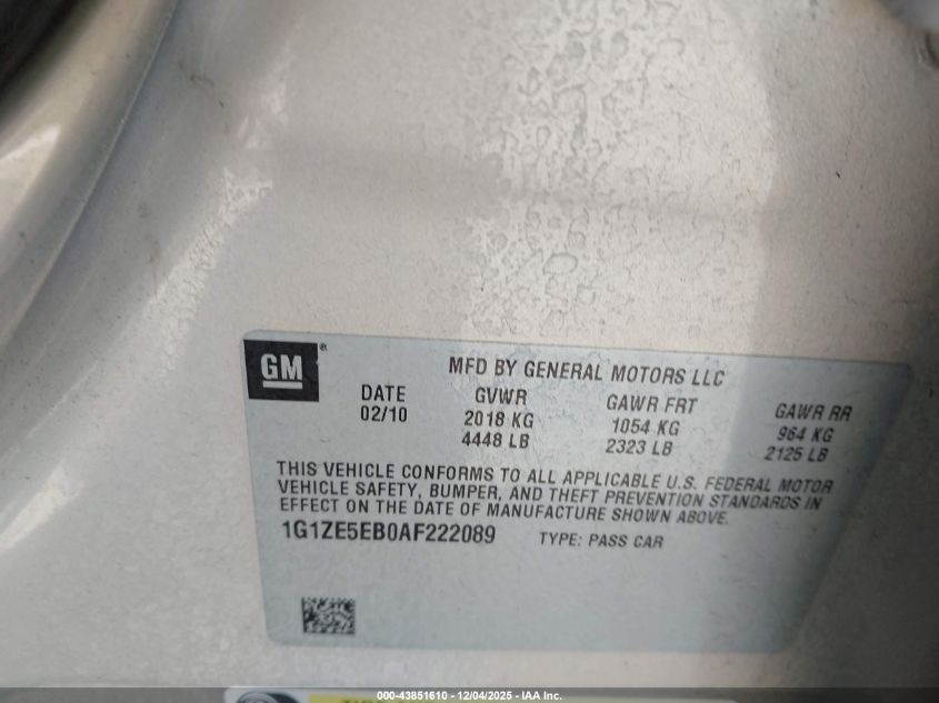 Колір БілийЦиліндри 4Привід Передній привідVIN 1G1ZE5EB0AF222089Стан СтаціонарноУшкодження Передня або задня