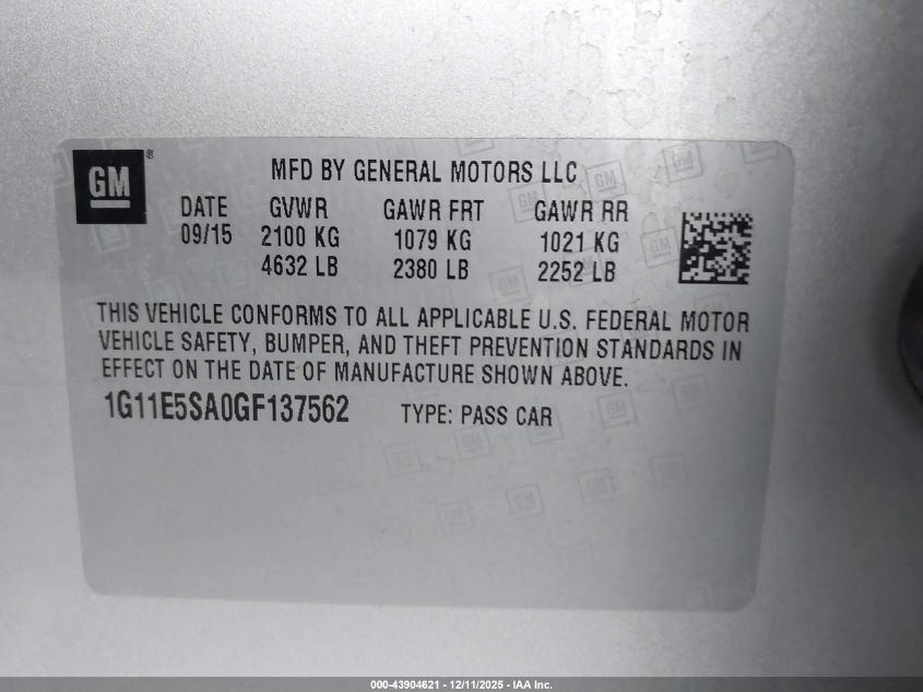 2016 CHEVROLET MALIBU 2016 року Бензин, 2.5, Передній привід, vin - 1G11E5SA0GF137562 з США