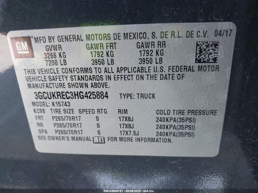 2017 CHEVROLET SILVERADO 1500 2017 року Бензин, 5.3, Повний привід, vin - 3GCUKREC3HG425884 з США