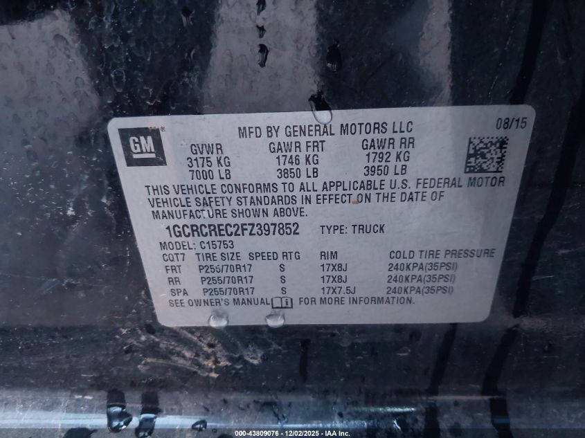 Колір ЧорнийЦиліндри 8VIN 1GCRCREC2FZ397852Стан СтаціонарноУшкодження Передня або задня