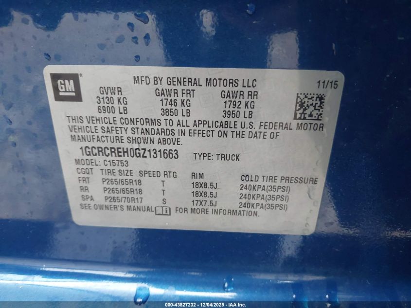 Колір СинійЦиліндри 6VIN 1GCRCREH0GZ131663Стан СтаціонарноУшкодження Передня ліва