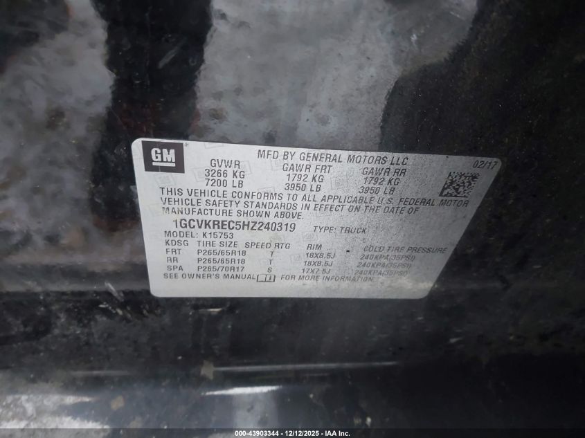 2017 CHEVROLET SILVERADO 1500 2017 року Бензин, 5.3, Повний привід, vin - 1GCVKREC5HZ240319 з США