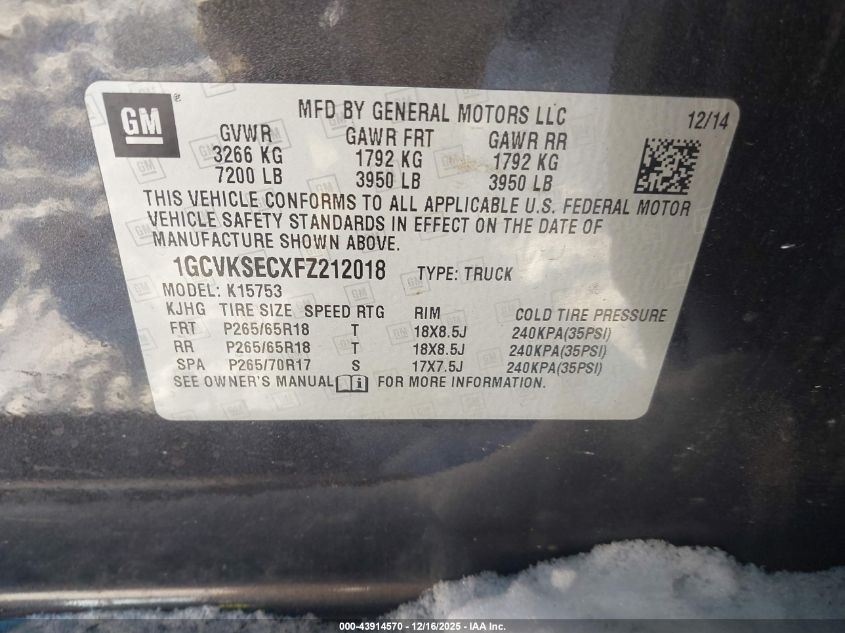 2015 CHEVROLET SILVERADO 1500 2015 року Бензин, 5.3, Повний привід, vin - 1GCVKSECXFZ212018 з США