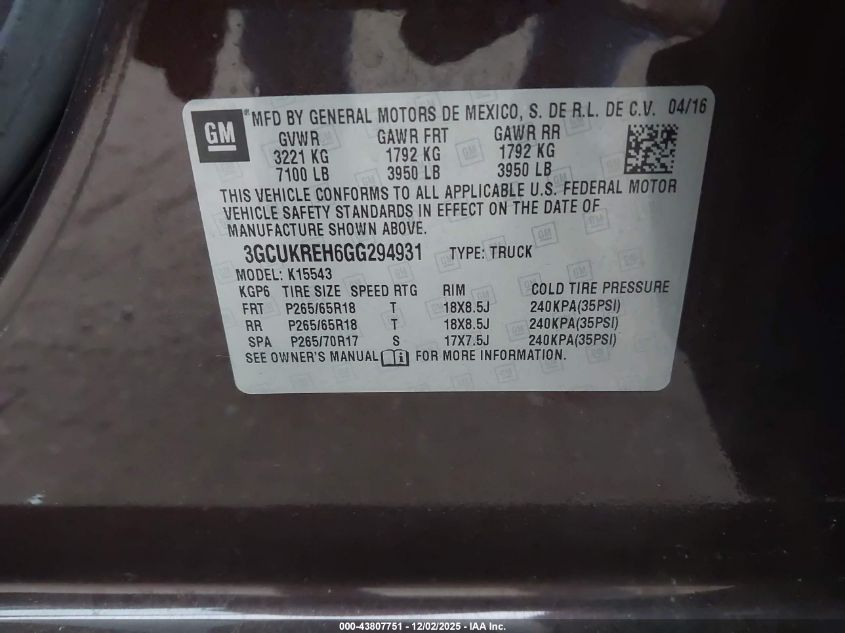 Колір КоричневийЦиліндри 6Привід Повний привідVIN 3GCUKREH6GG294931Стан Заводиться та їде (перевірено)Ушкодження Передня або задня