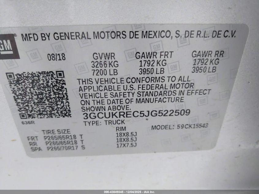 Колір СрібнийЦиліндри 8Привід Повний привідVIN 3GCUKREC5JG522509Стан СтаціонарноУшкодження Передня або задня