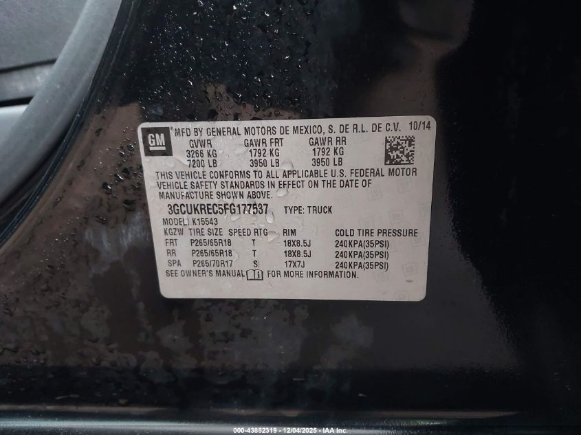 2015 CHEVROLET SILVERADO 1500 2015 року Бензин, 5.3, Повний привід, vin - 3GCUKREC5FG177537 з США