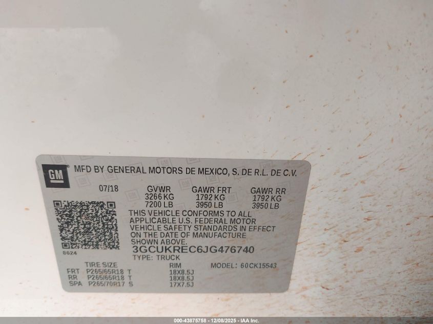 2018 CHEVROLET SILVERADO 1500 2018 року Бензин, 5.3, Повний привід, vin - 3GCUKREC6JG476740 з США