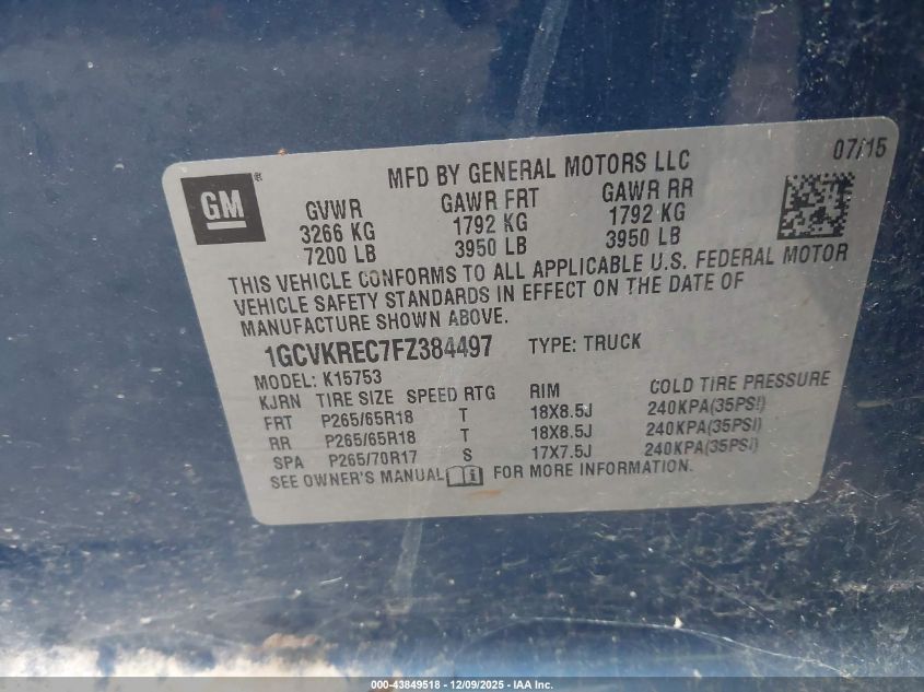 2015 CHEVROLET SILVERADO 1500 2015 року Бензин, 5.3, Повний привід, vin - 1GCVKREC7FZ384497 з США