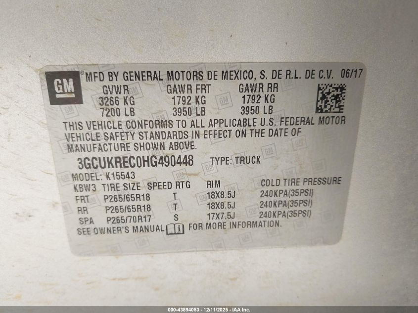 2017 CHEVROLET SILVERADO 1500 2017 року Бензин, 5.3, Повний привід, vin - 3GCUKREC0HG490448 з США
