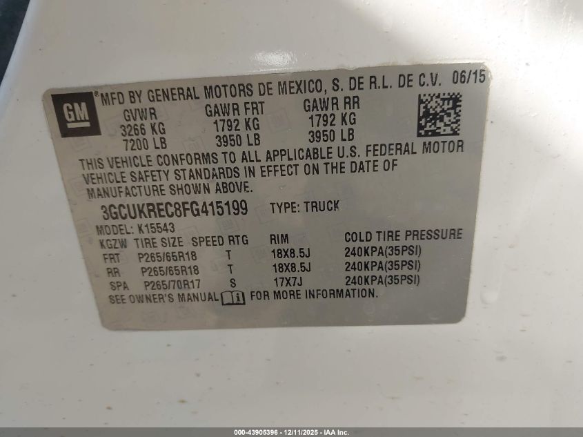 Колір БілийЦиліндри 8Привід Повний привідVIN 3GCUKREC8FG415199Стан СтаціонарноУшкодження Невідомо