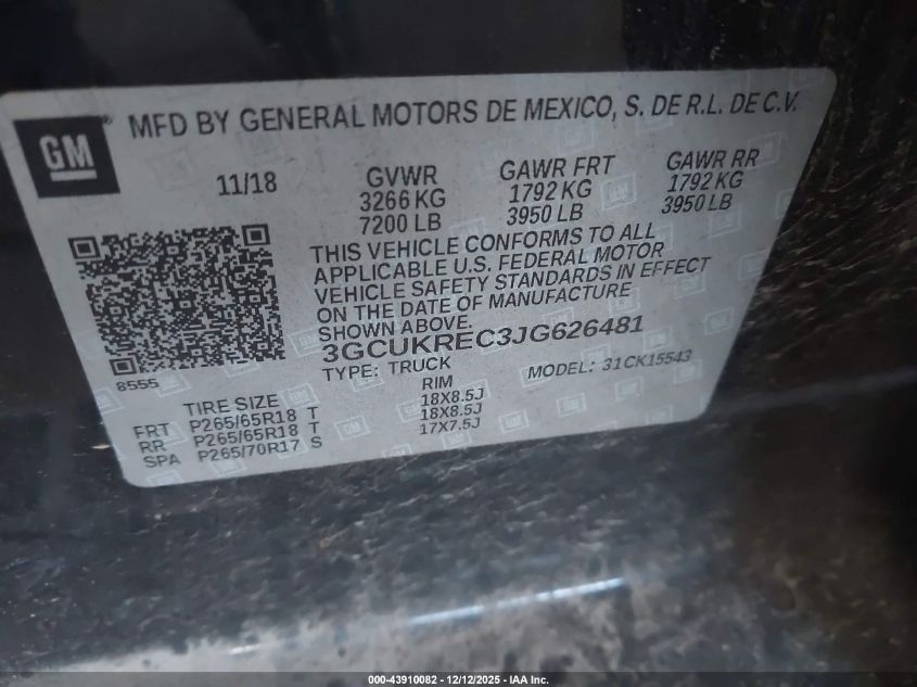 Колір ЧорнийЦиліндри 8Привід Повний привідVIN 3GCUKREC3JG626481Стан Заводиться та їде (перевірено)Ушкодження Задня