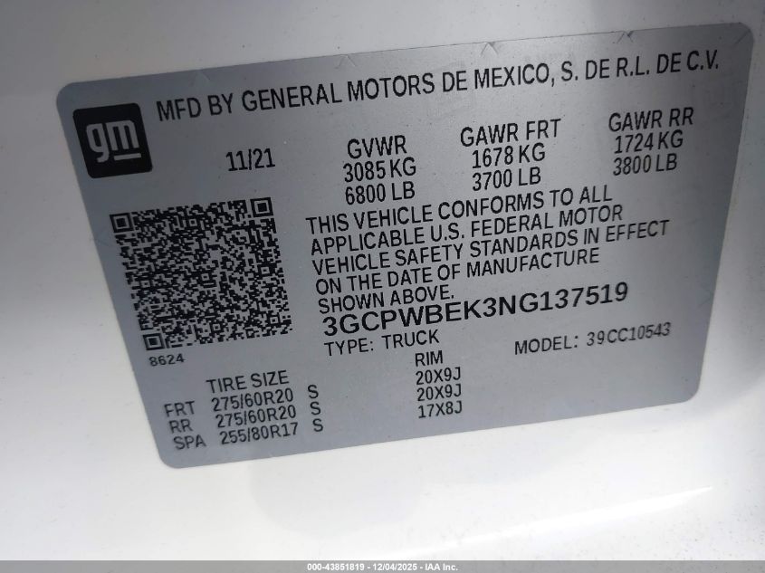 Колір БілийЦиліндри 4VIN 3GCPWBEK3NG137519Стан Заводиться та їде (перевірено)Ушкодження Передня або задня