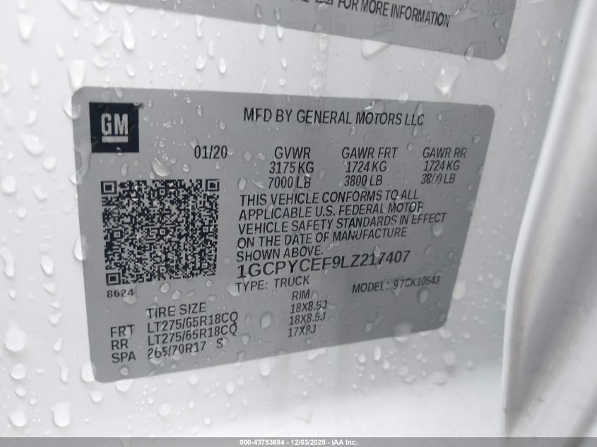 2020 CHEVROLET SILVERADO 1500 2020 року Бензин, 5.3, Повний привід, vin - 1GCPYCEF9LZ217407 з США