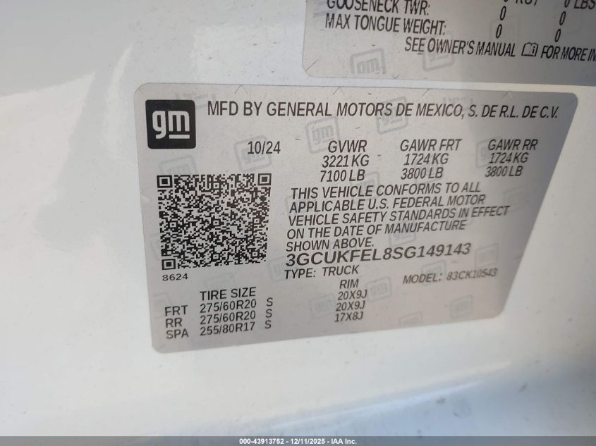 2025 CHEVROLET SILVERADO 1500 2025 року Бензин, 6.2, Повний привід, vin - 3GCUKFEL8SG149143 з США