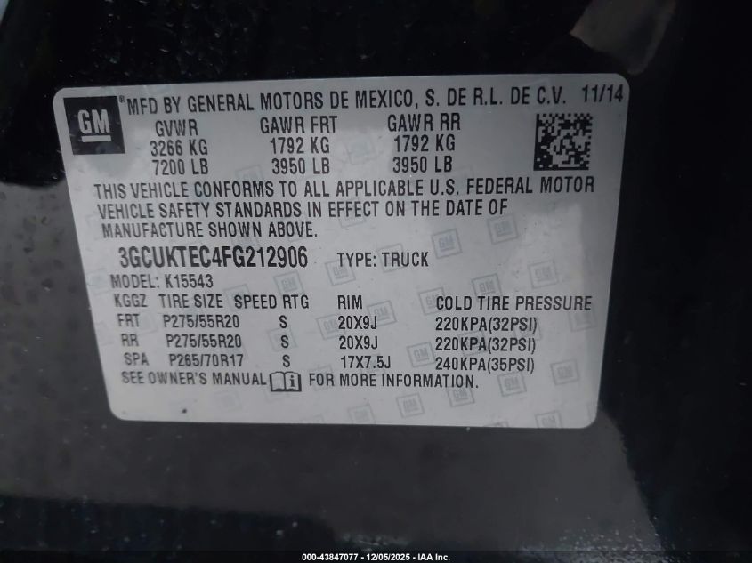 2015 CHEVROLET SILVERADO 1500 2015 року Бензин, 5.3, Повний привід, vin - 3GCUKTEC4FG212906 з США