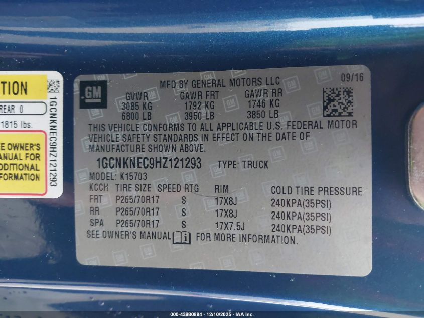 2017 CHEVROLET SILVERADO 1500 2017 року Бензин, 5.3, Повний привід, vin - 1GCNKNEC9HZ121293 з США