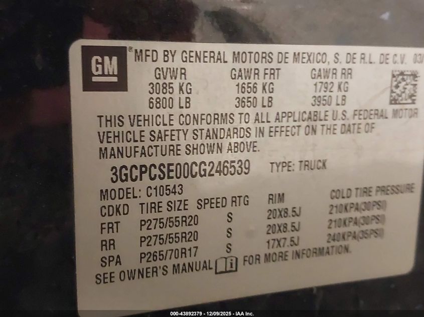Колір ЧорнийЦиліндри 8VIN 3GCPCSE00CG246539Стан СтаціонарноУшкодження Передня права
