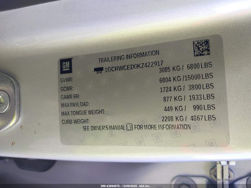 Колір СрібнийЦиліндри 8VIN 1GCRWCED0KZ422917Стан Заводиться та їде (перевірено)Ушкодження Передня або задня