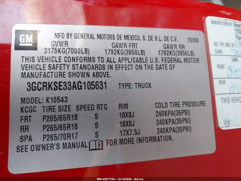 2010 CHEVROLET SILVERADO 1500 2010 року Бензин, 5.3, Повний привід, vin - 3GCRKSE33AG105631 з США