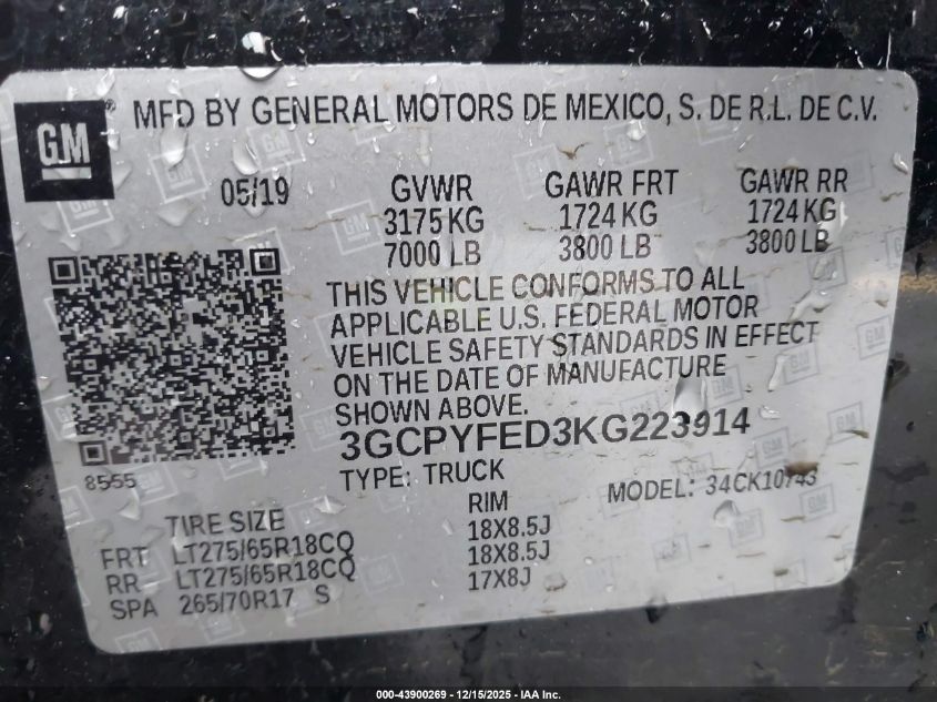 Колір ЧорнийЦиліндри 8Привід Повний привідVIN 3GCPYFED3KG223914Стан Заводиться та їде (перевірено)Ушкодження Передня або задня