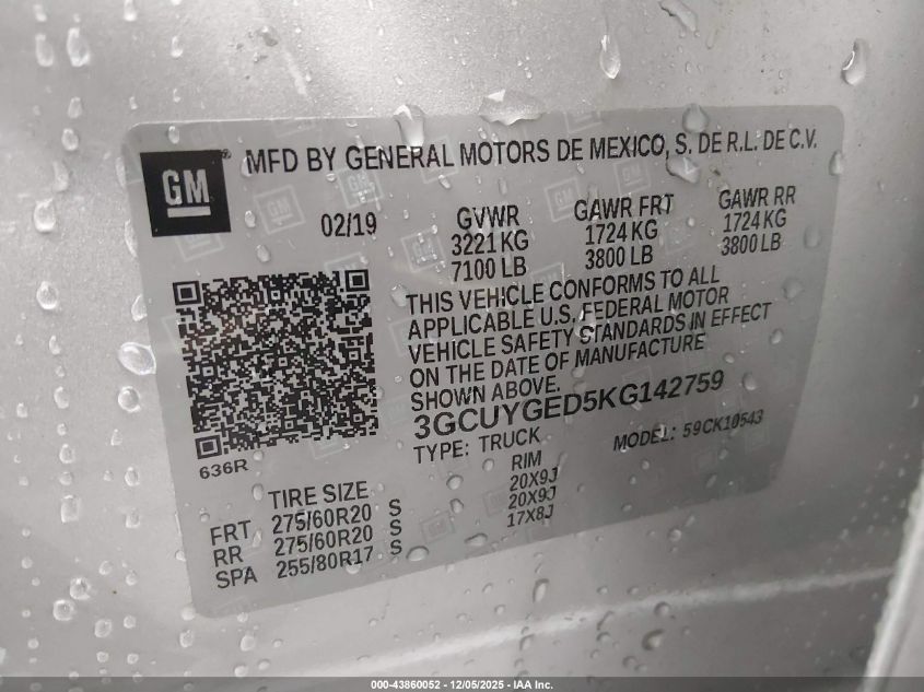 Колір СрібнийЦиліндри 8Привід Повний привідVIN 3GCUYGED5KG142759Стан СтаціонарноУшкодження Передня або задня