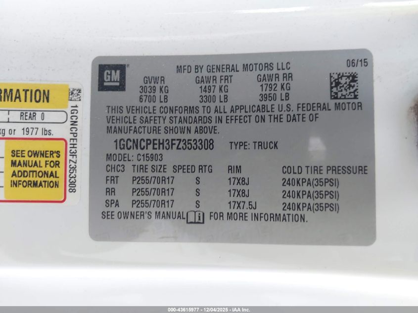 2015 CHEVROLET SILVERADO 1500 2015 року Бензин, 4.3, , vin - 1GCNCPEH3FZ353308 з США