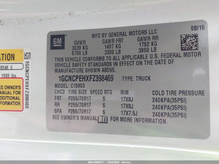 2015 CHEVROLET SILVERADO 1500 2015 року Бензин, 4.3, , vin - 1GCNCPEHXFZ398469 з США