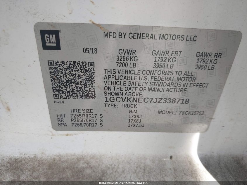 2018 CHEVROLET SILVERADO 1500 2018 року Бензин, 5.3, Повний привід, vin - 1GCVKNEC7JZ338718 з США