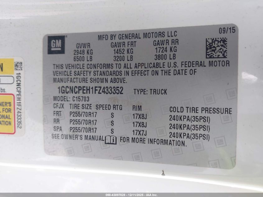 Колір Циліндри 6VIN 1GCNCPEH1FZ433352Стан НевідомоУшкодження Передня або задня