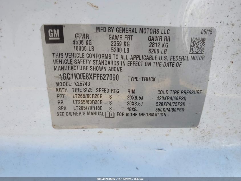 Колір БілийЦиліндри 8Привід Повний привідVIN 1GC1KXE8XFF627090Стан СтаціонарноУшкодження Передня і задня
